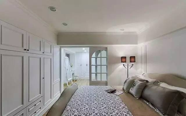 主卧临近本有一间房,根据需求,将该房间改造为主卧的步入式衣帽间,中间以玻璃窗格推拉门作为隔断,视觉的穿透感极强,让主卧空间更显大。