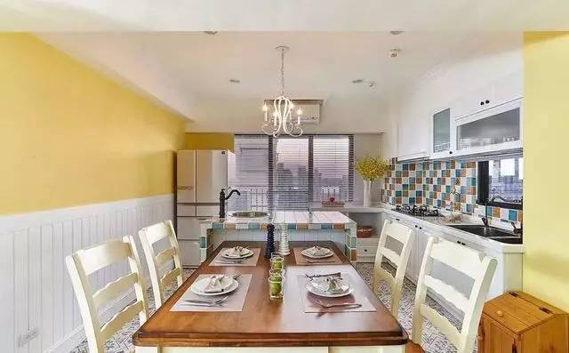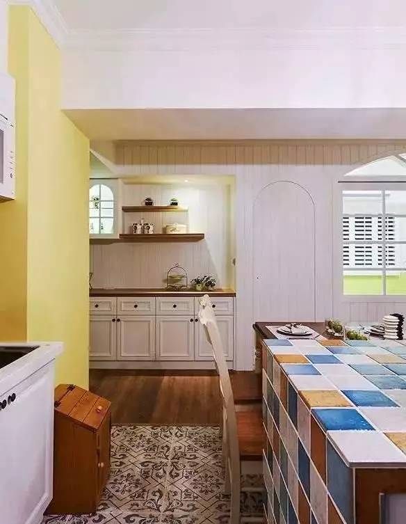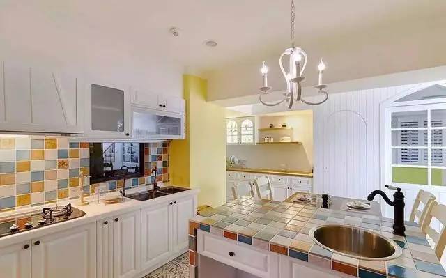 餐厨区则一改深沉的颜色,在白色橱柜的基础上,采用欢乐明亮的色调来铺设整个空间,这一切都少不了活泼的马赛克砖。