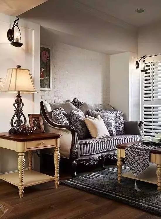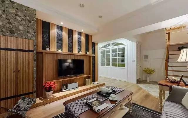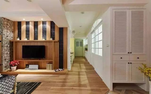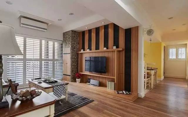 耐磨木地板以及实木贴皮电视背景墙,搭配欧式田园必备沙发白色文化石背景墙,以及特意定制的百叶窗,让呈现深浅色的客厅散发随性悠然的调调,阳光正好,休闲舒适。