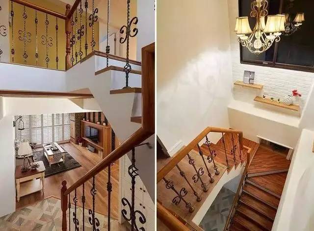 在进入复式楼楼梯区域前以不规则花砖铺设,场景满满过度到楼梯空间;楼梯以木色搭配古典纹路的扶手,在转角的立面上更是用文化石以及隔板打造展示收纳空间,再以一盏华丽的吊灯点缀,整体装饰效果满分,呈现有温度的装修设计。
