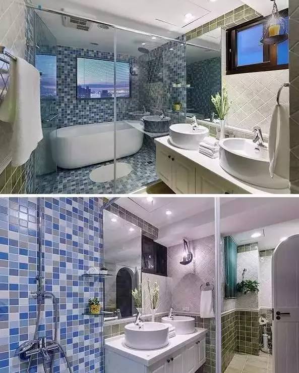 卫浴间一览,不同的马赛克瓷砖作为装饰,拼贴出新的装修质感,层次分明。